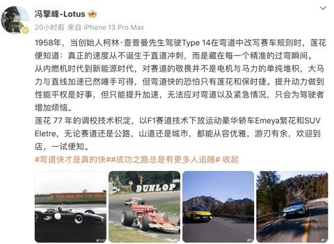 近日,莲花集团首席执行官冯擎峰在一篇公开文章中提到,无论是内燃机时代还是新能源时代,对于赛道的追求不应仅停留在电机与马力的简单叠加。他指出,如今大马力和直线加速性能已经变得触手可及,但真正能够在弯道表现出色的汽车品牌,恐怕只有莲花和保时捷。